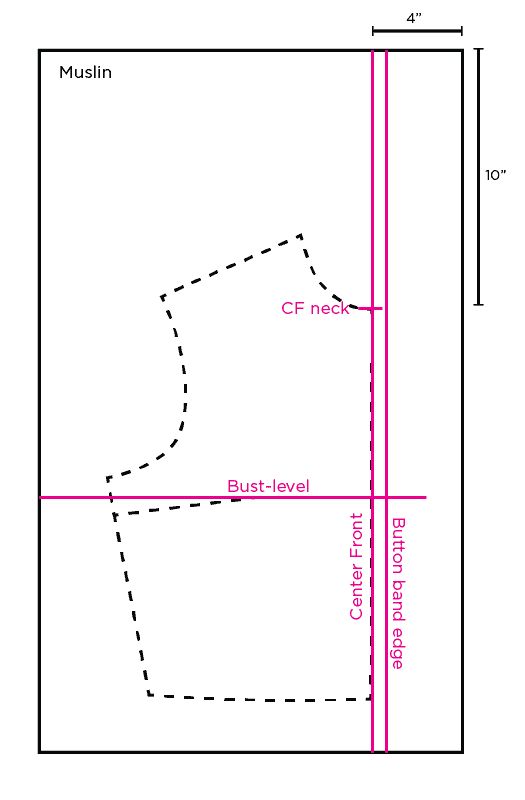 To get my drape started, I traced off my front block onto a piece of muslin. I added some extra room above and to the right of CF for the shawl collar extension. Here’s how I laid it out:
