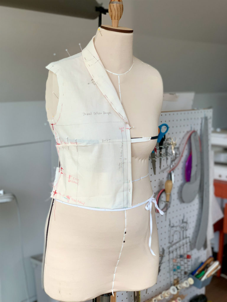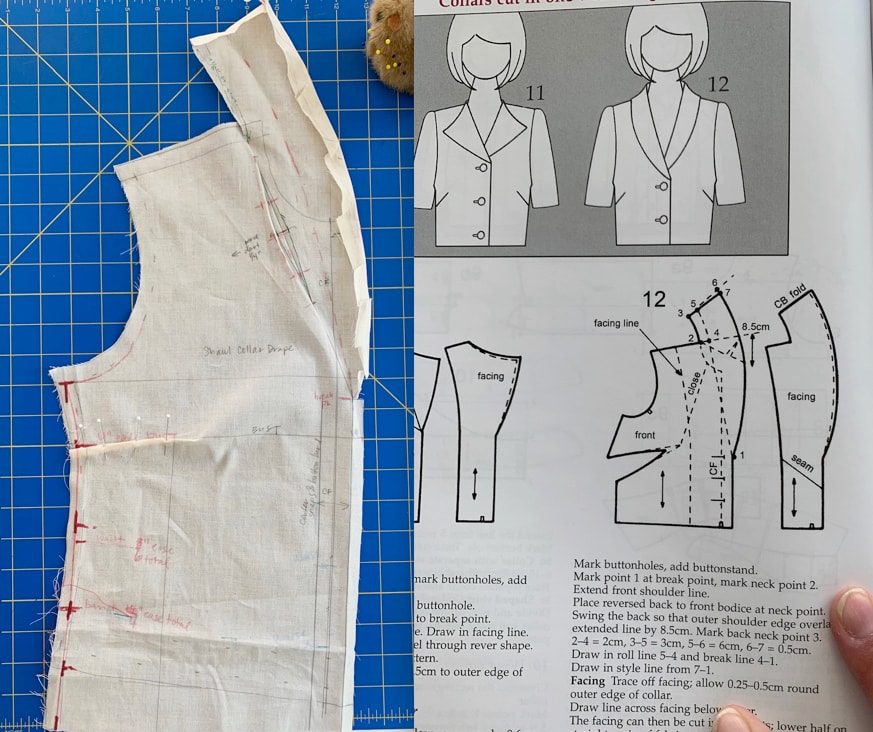 For a guide to drape the collar, I consulted Connie Amaden-Crawford’s The Art of Fashion Draping. Way back when I was rushing to complete my Fablibs look, I found this book super helpful for draping a notched collar.